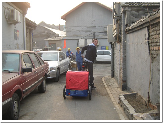 En général, nous empruntons les pistes cyclables pour nous déplacer, d’autant plus qu’Iskande nous suit lui aussi à vélo. Dans les Hutongs les routes sont si étroites que deux voitures ne peuvent pas se croiser. (étroit est relatif, à Pékin n’importe quelle rue est composée de deux fois trois voies sans compter les deux pistes cyclables)